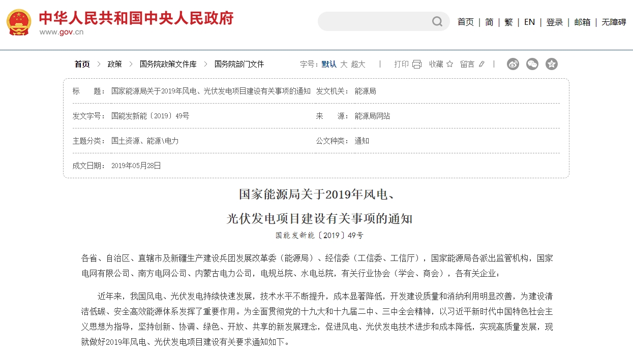 國(guó)家能源局關(guān)于2019年風(fēng)電、 光伏發(fā)電項(xiàng)目建設(shè)有關(guān)事項(xiàng)的通知
