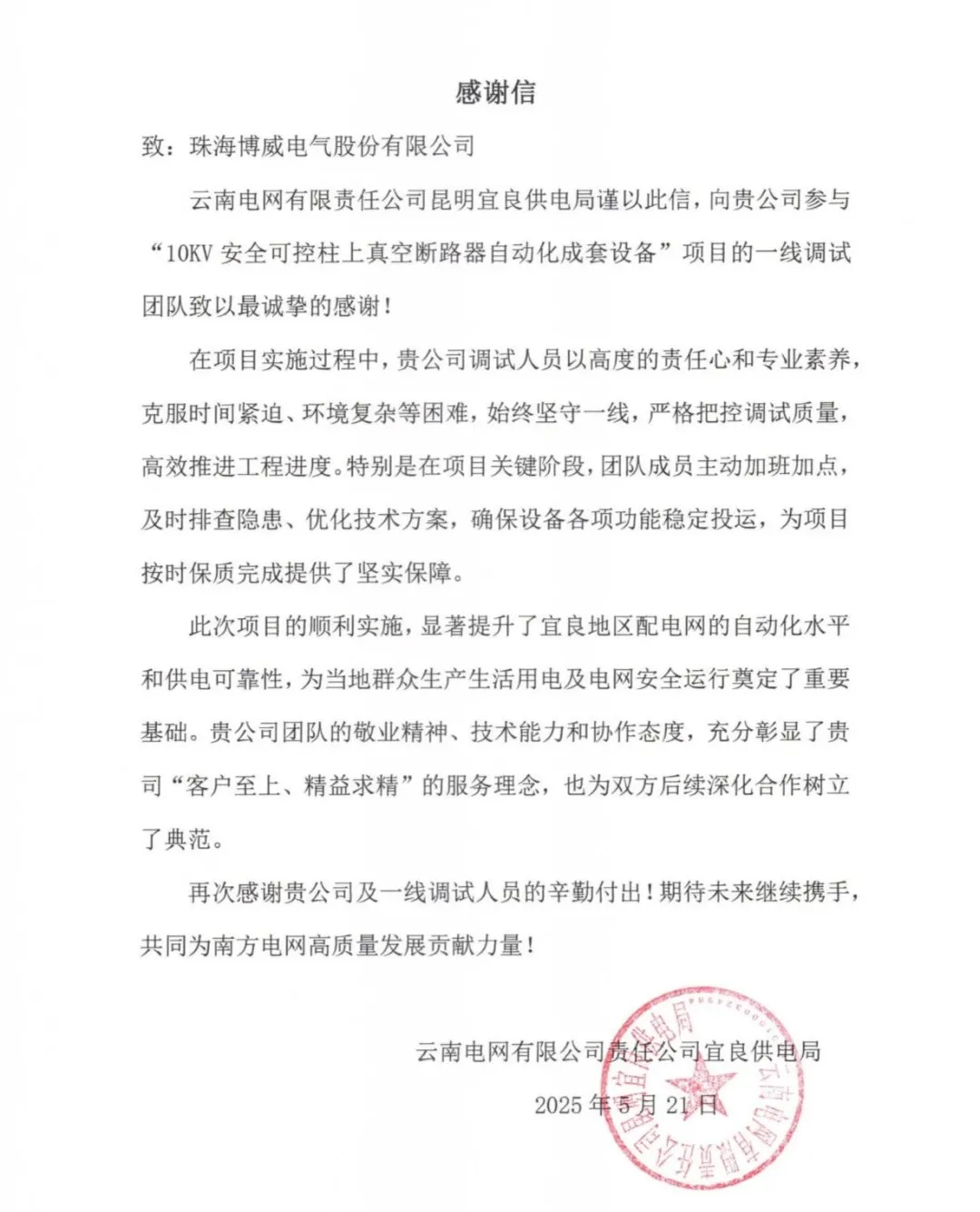 信中寫道:“貴公司調(diào)試人員以高度的責(zé)任心和專業(yè)素養(yǎng)克服時(shí)間緊迫、環(huán)境復(fù)雜等困難,始終堅(jiān)守一線,嚴(yán)格把控調(diào)試質(zhì)量,高效推進(jìn)工程進(jìn)度。此次項(xiàng)目的順利實(shí)施,顯著提升了宜良地區(qū)配電網(wǎng)的自動(dòng)化水平和供電可靠性,為當(dāng)?shù)厝罕娚a(chǎn)生活用電及電網(wǎng)安全運(yùn)行奠定了重要基礎(chǔ)。”